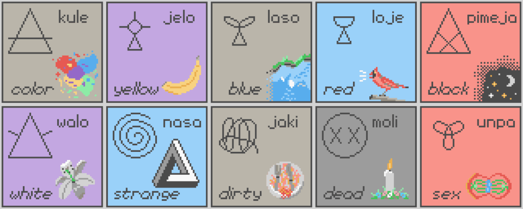 This is the project that sparked my recent interest in toki pona: A pixel art “alphabet book” of toki pona’s common vocabulary. Every entry uses the same visual format as closely as possible, and there are two hard constraints I introduced at the beginning to keep this project more manageable.